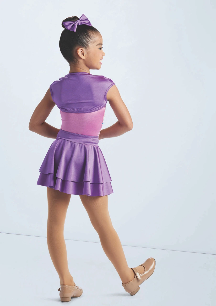 Pull-on tricot tutu has satin ribbon trim and rose floral spray