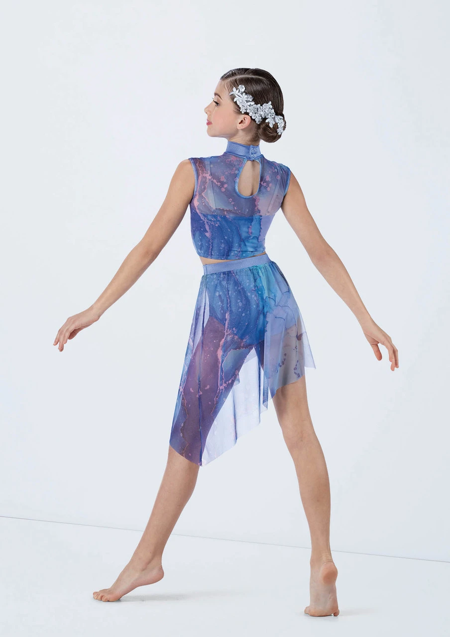 -Asymmetrical skirt is marble print mesh over attached briefs