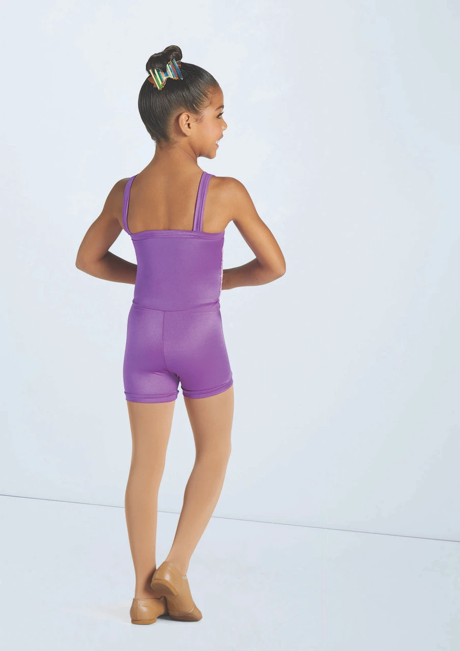 Biketard has front bodice overlay of iridescent crosshatch sequin